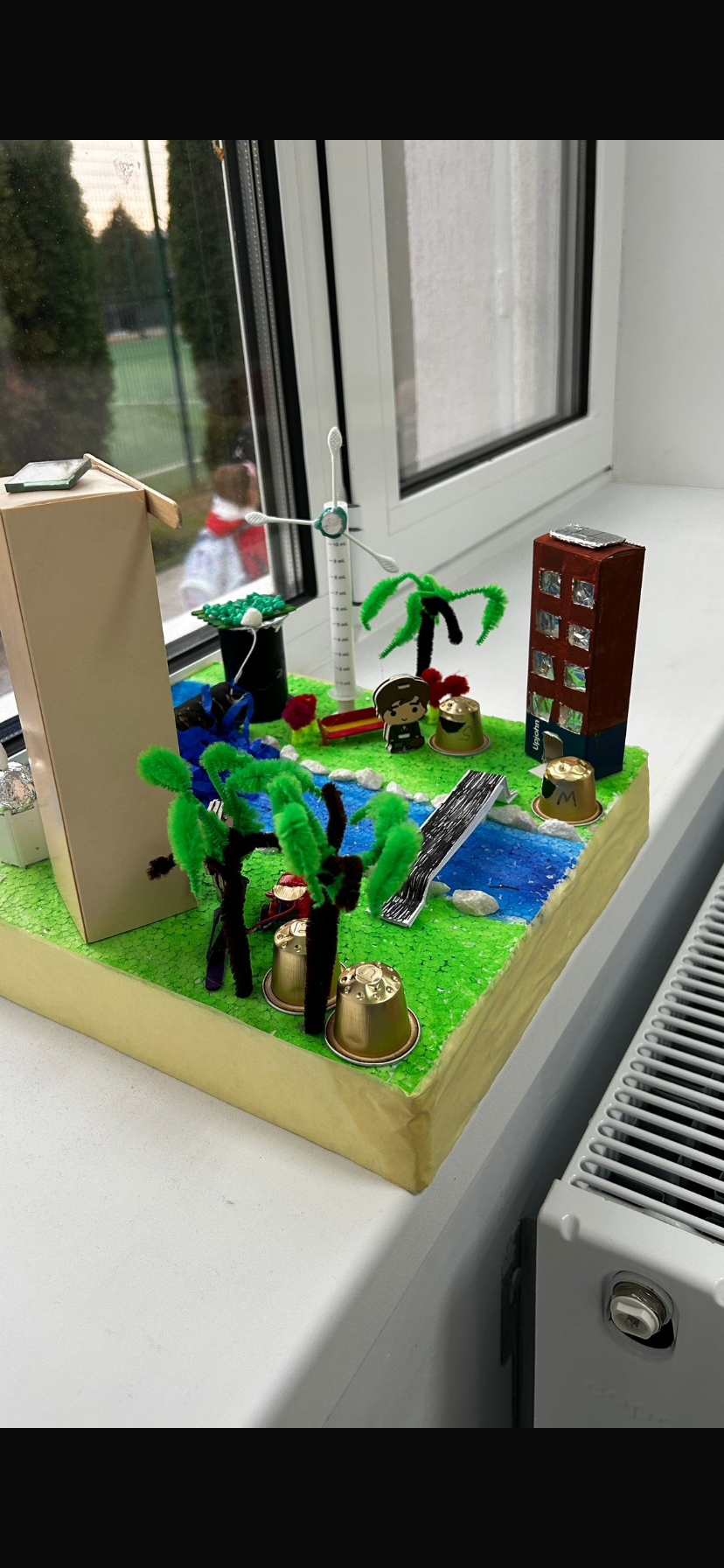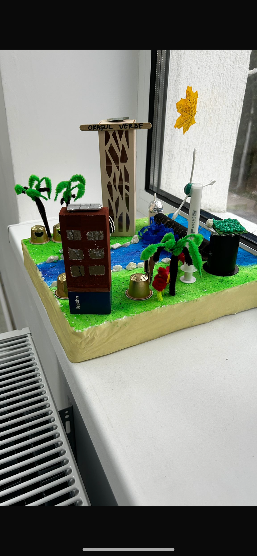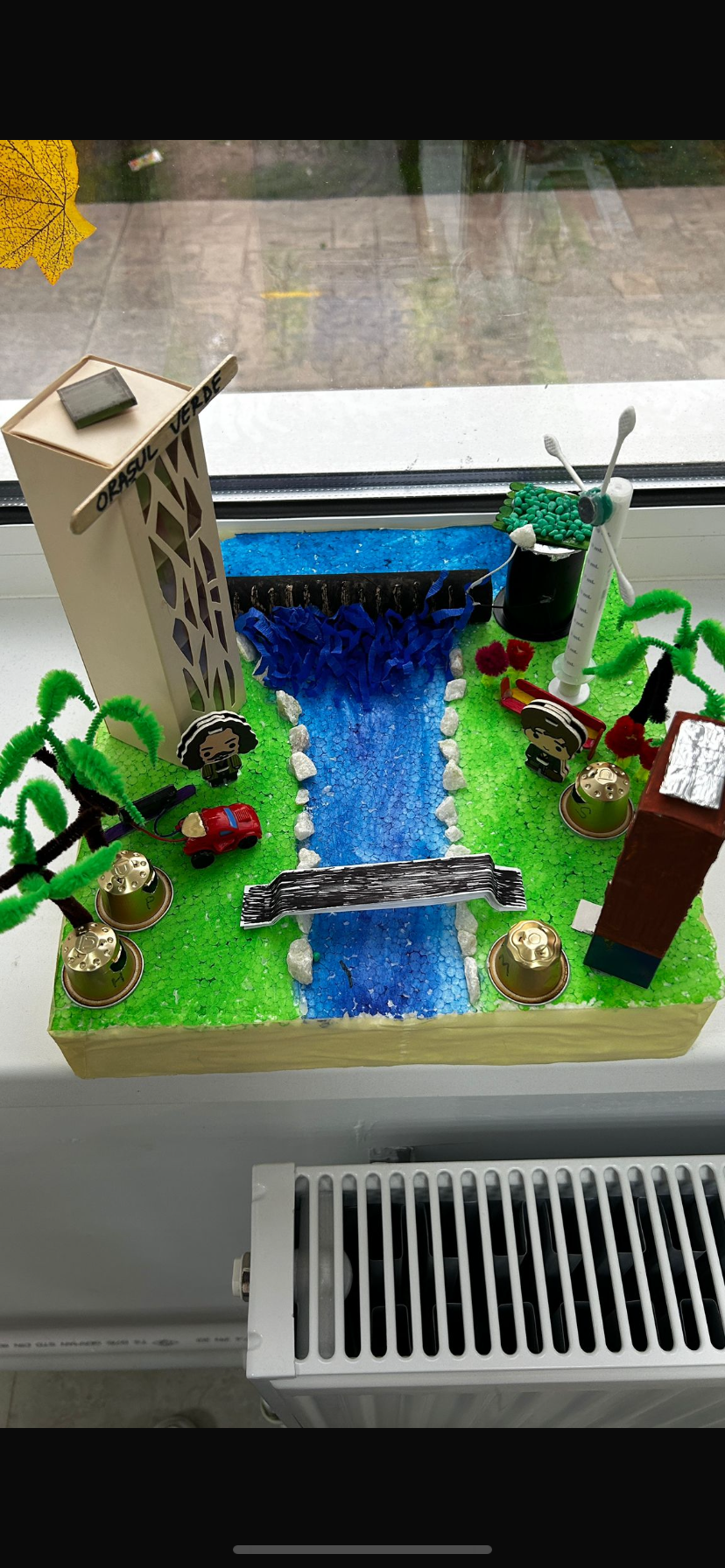 Captura din raul Dambovita cu hidrocentrala, centrala eoliana, blocuri cu panouri solare si statie de incarcare masini electrice si zone de colectare selectiva a deseurilor; centrala cu zona verde pe acoperis.